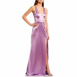 Best Pirce ๐ B. Darlin Sleeveless Plunged V-Neck X-Back Side-Slit Satin Knit Ball Gown Lilac ๐