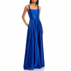 Cheap ๐ B. Darlin Square-Neck Satin Bar-Back High Side Slit Long ๐ Dress Dark Royal ๐ฅ